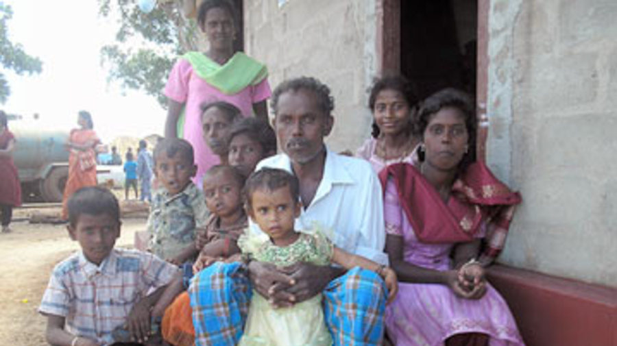One of the beneficiary families of the UNHCR-funded relocation project sit on the doorstep of their new home in Vavuniya.