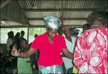UNHCR's sub-office head in Kissidougou, Roseline Idowu, dancing with refugees during the concert.