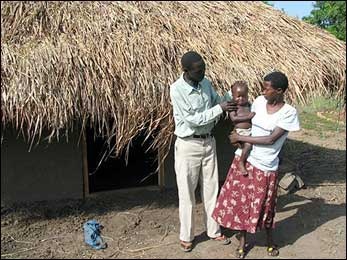 Returning refugee Paul Mabe (with his daugher and her child) built the house near Yei with his own hands.