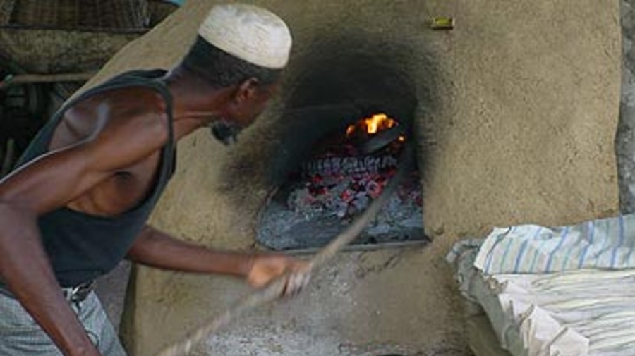 Ivorian refugee Sory Cissé baking bread in his home-made oven.