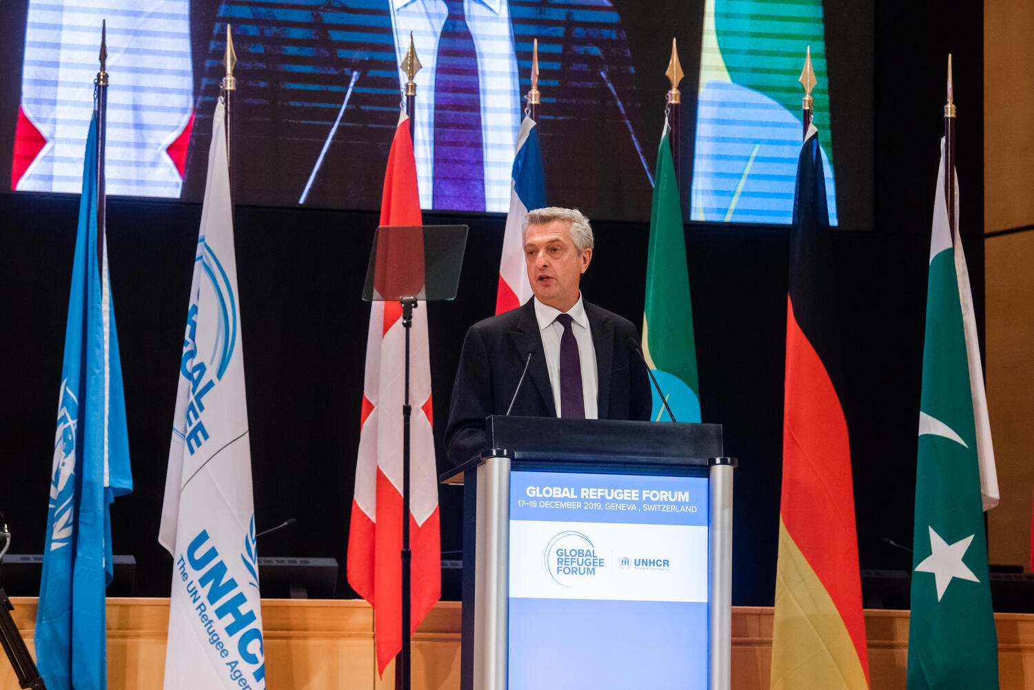 UN High Commissioner for Refugees Filippo Grandi addresses the Global Refugee Forum.