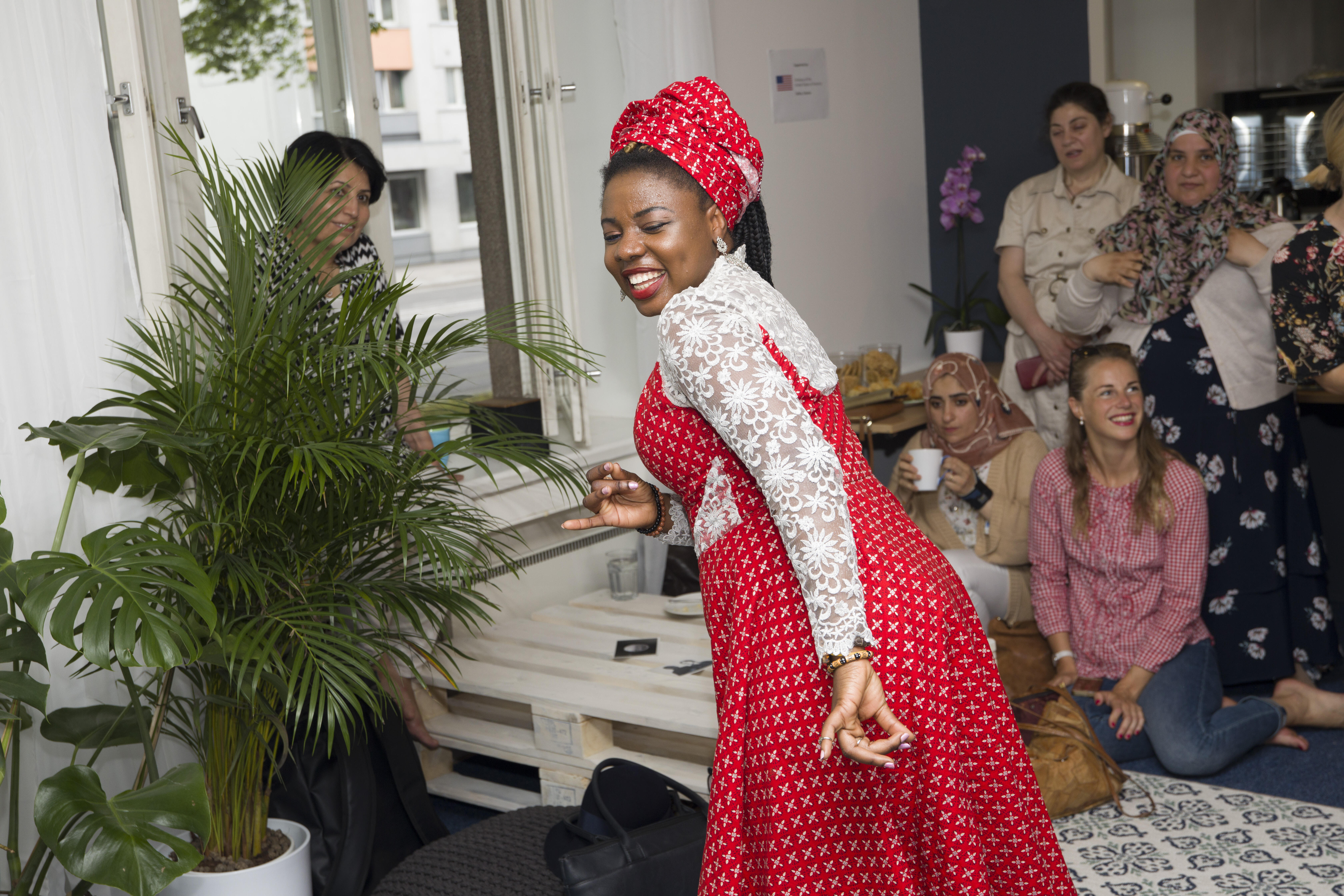 Nigerian refugee Dami dancing at the opening of the Estonian Refugee Council's new centre in Tallinn.