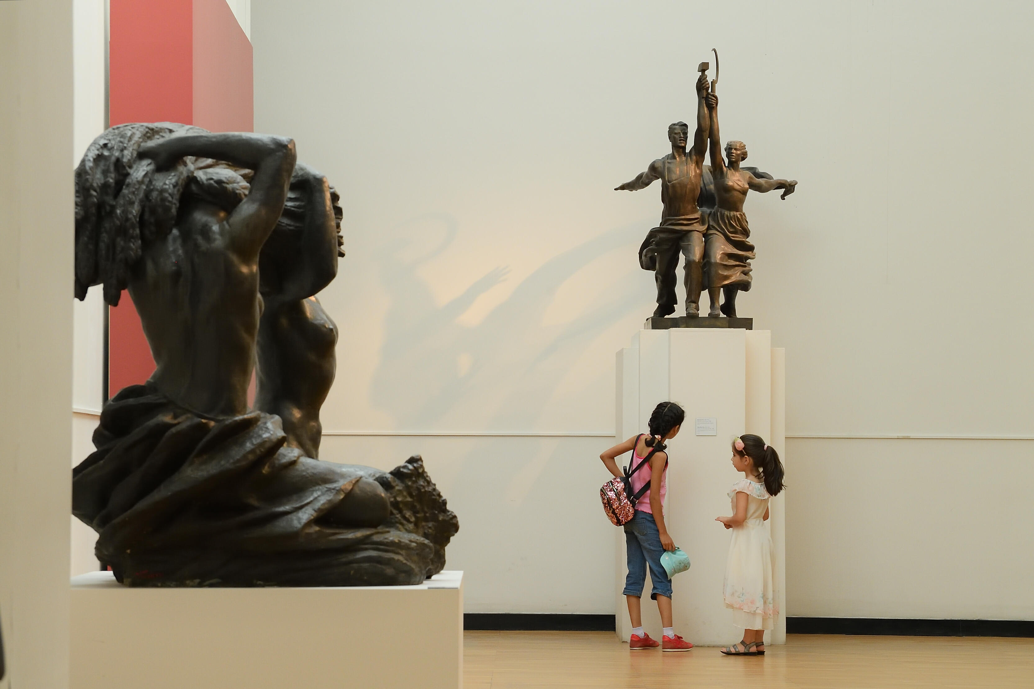 Two Afghan girls admiring artworks at the State Tretyakov gallery in Moscow during the inter-museum festival "Point of Displacement."