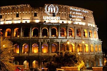 Rome's fabled Colosseum illuminated with the UNHCR logo and the message: "Protecting refugees is a duty. Being protected is a right."