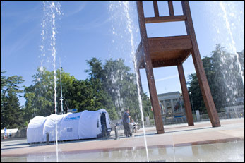 The lightweight family tent next to Geneva's "Broken Chair" artwork symbolizing the victims of landmines, including refugees and the internally displaced.