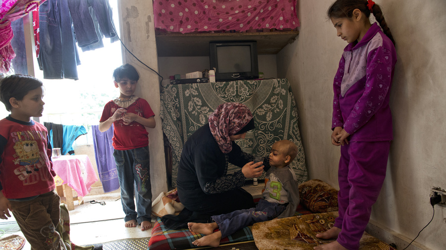 Feryal, 29, gives water to Zacharia, her four-year-old son, in the apartment they live in in Halat. He is dying of cancer. In Syria, the trip to hospital became too dangerous. "I was afraid," said Feryal. By the time they reached Lebanon, the cancer had spread to his brain, she says, adding: "I failed him."