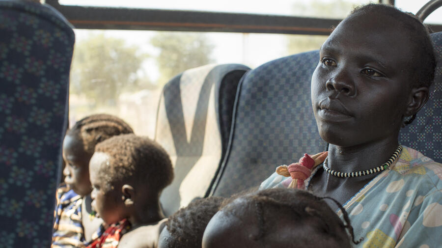 Sudanese refugee Amal Bakith and her children ride a UNHCR bus to Ajuong Thok camp in South Sudan.