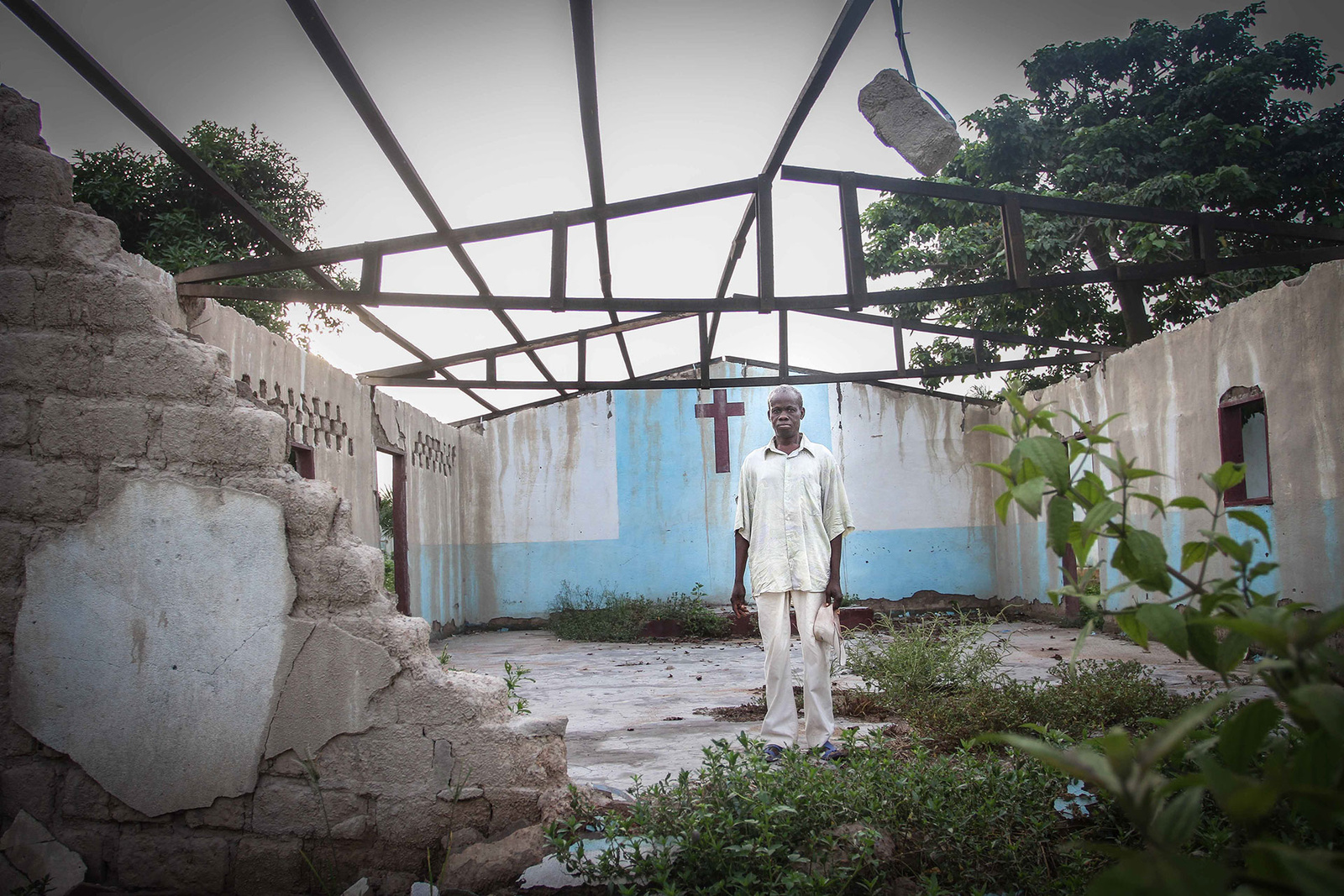 Only a few walls of his church remain, a painted red cross still visible on one of them. Nature is reclaiming the neighbourhood. Saddened by the desolate spectacle of his home, Ambroise makes his way through the tall grass, running his fingers over the peeling paint and crumbling walls, as he recalls how lively the place once was.