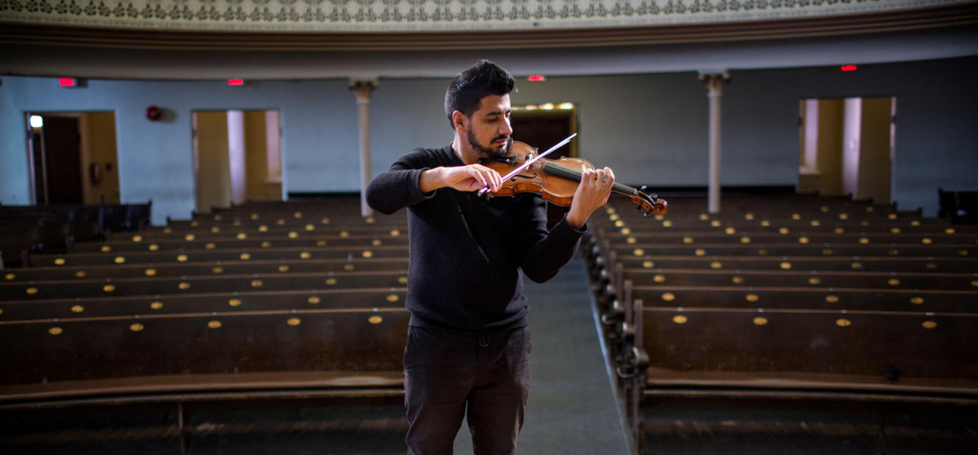 Sari plays his violin in the Alix Goolden Performance Hall, part of the Victoria Conservatory of Music.