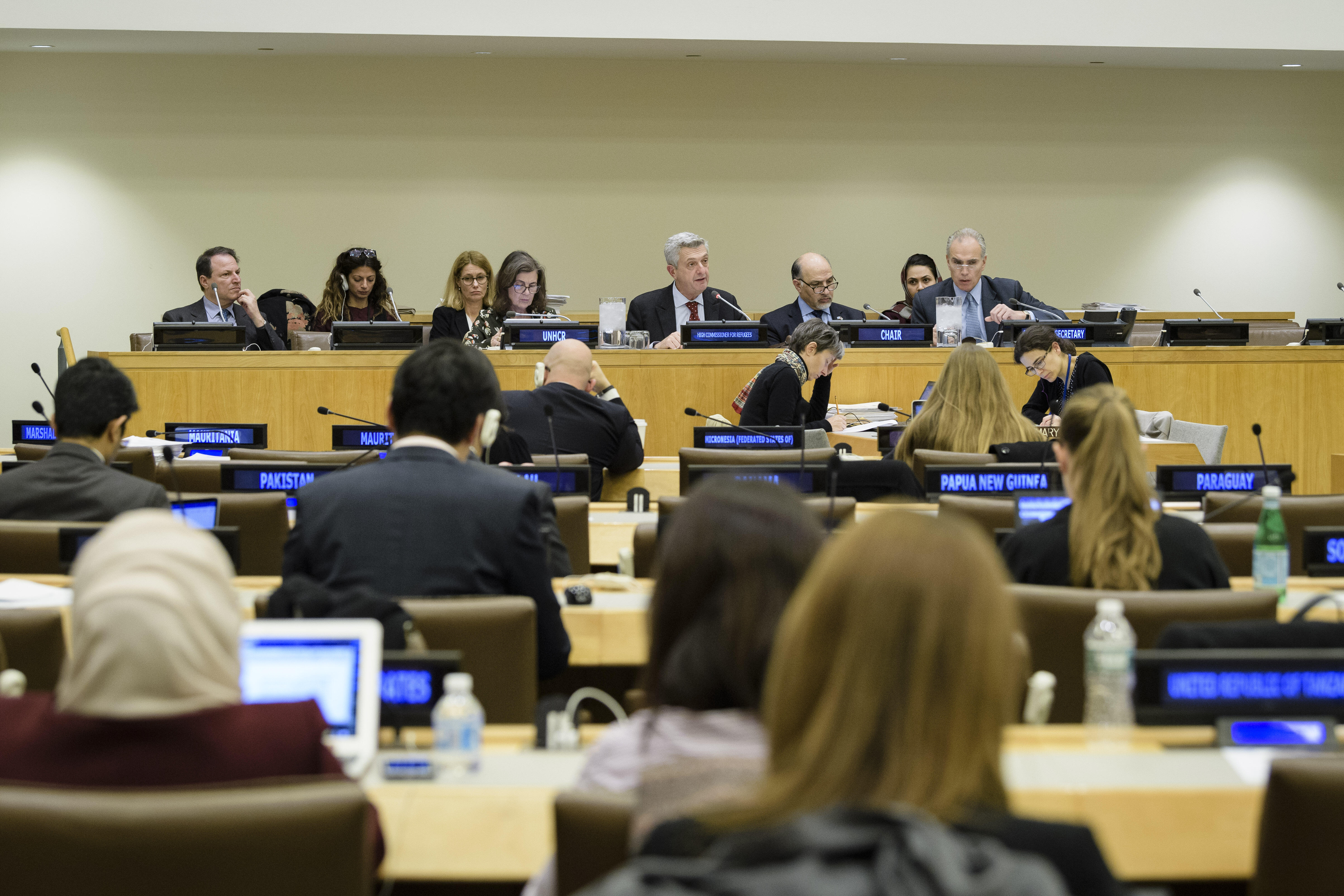 UN High Commissioner for Refugees Filippo Grandi (centre at dais) proposes a new international deal for refugees at the UN General Assembly's Third Committee in New York on October 31, 2018.