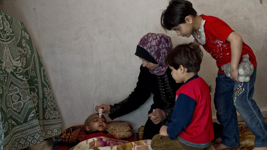 Four-year-old Syrian refugee Zacharia lies dying of a brain tumour as his mother gives him water and his siblings look on with love and concern. He had been receiving treatment in Syria, but in Lebanon his health deteriorated dramatically.