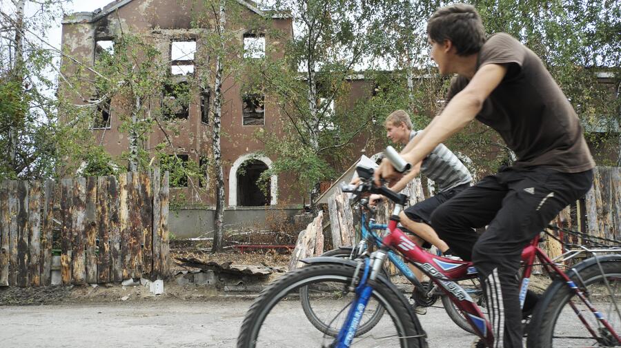 Cyclists passing a residential building hit by artillery in the village of Semenovka on the outskirts of Slaviansk, Donetsk region. Over the weeks of the city's siege, over half of its population left their homes, but thousands of IDP's later returned, many finding their homes destroyed in the fighting.