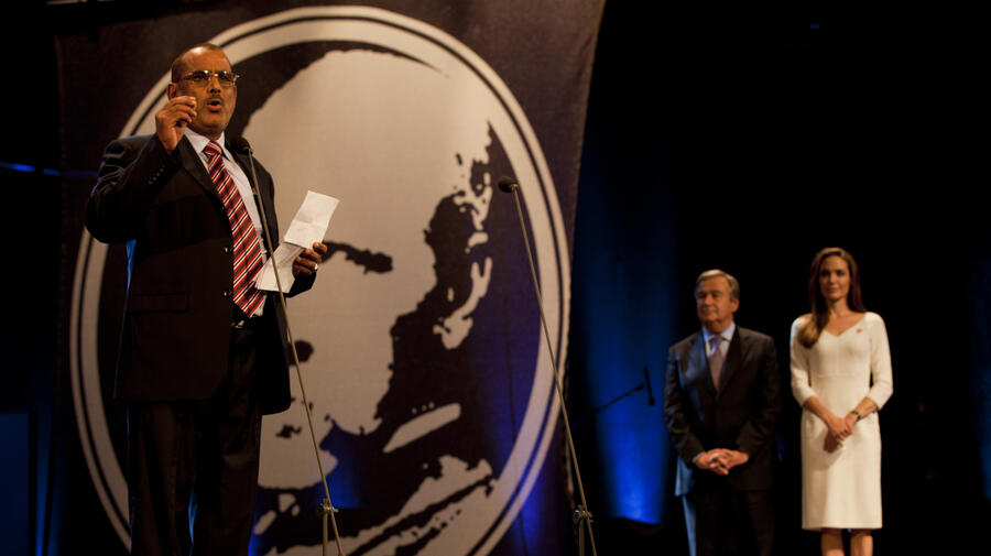 SHS founder Nasser Salim Ali Al-Hamairy makes an acceptance speech as Angelina Jolie and UNHCR chief António Guterres look on.