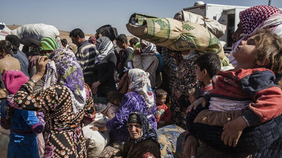 Refugees wait to board buses after crossing the border from Syria into Turkey after fleeing fighting around the city of Kobani in September 2014