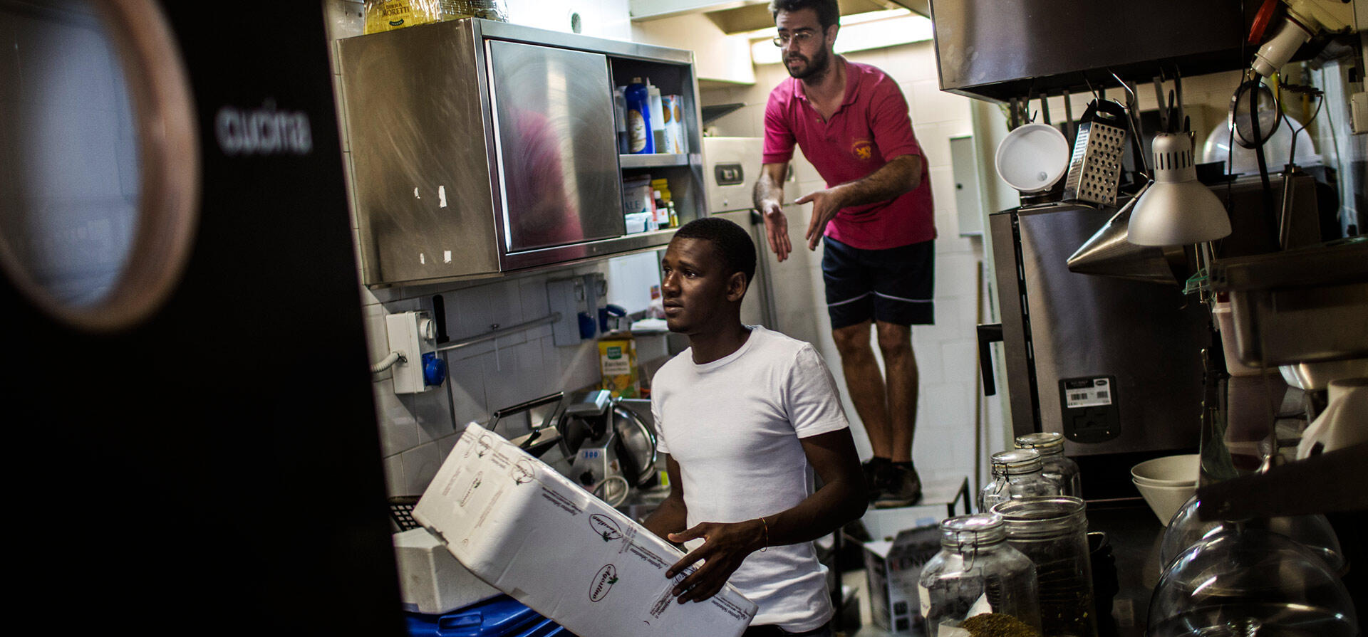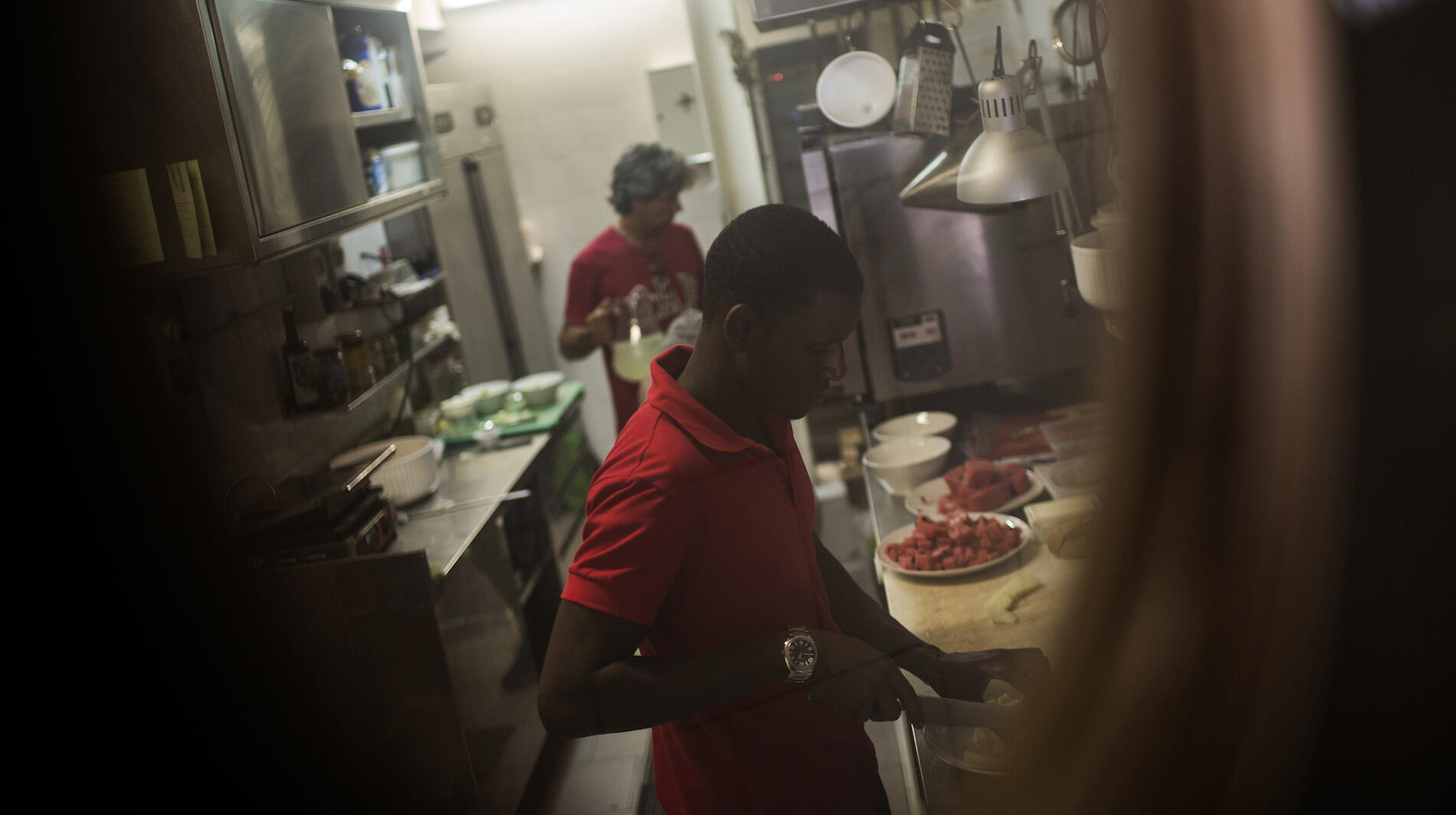 Yahya and a colleague prepare food at the restaurant where they work in Catania.