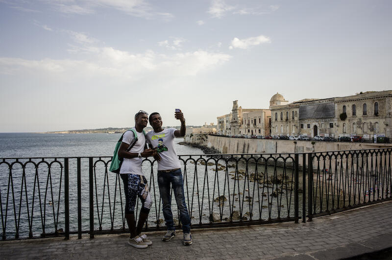 Yahya and his cousin Aliou take a selfie on the seafront of Ortigia, where he used to go during his first months in Italy.