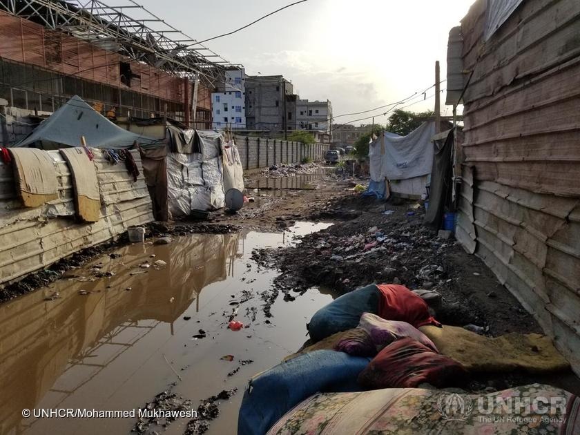 Une fillette marche le long d’une zone inondée dans un site de déplacés internes à Aden, au Yémen. Mars 2020. © HCR/Essam Adduais