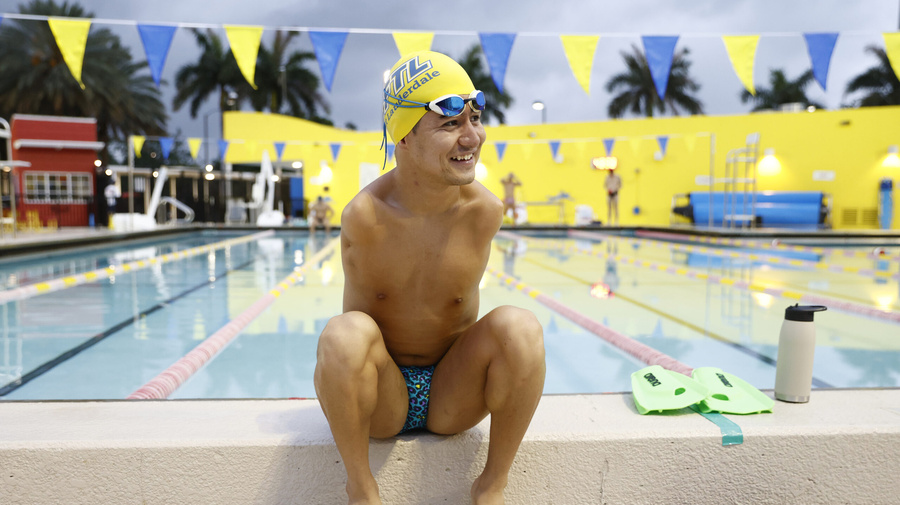 Abbas Karimi, un nageur réfugié afghan né sans bras, s’entraîne à Fort Lauderdale, en Floride (États-Unis). © Getty Images/Michael Reaves