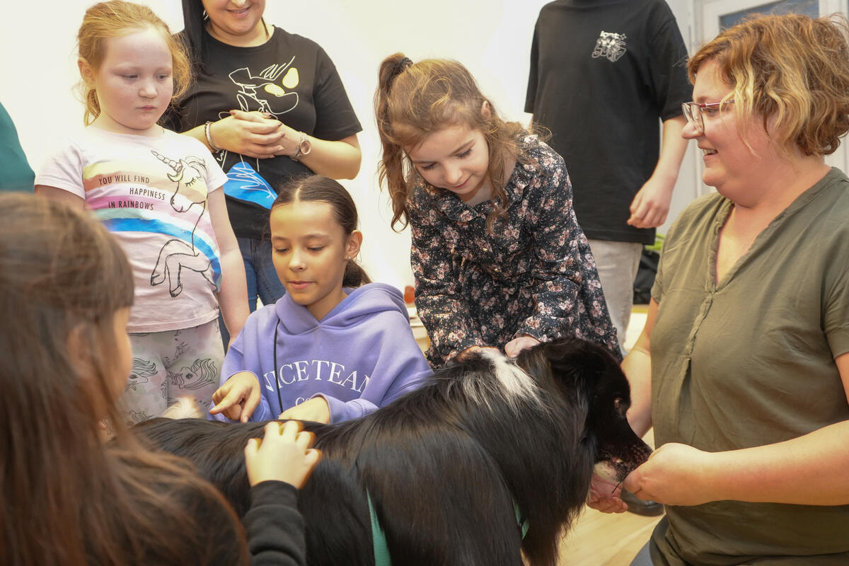 Pendant ce temps, de retour dans la pièce avec Noir, le chien de compagnie, l'atmosphère est passée du calme à l'excitation. Une fois que les enfants se sont habitués à Noir, le maître-chien Tímea les encourage à jouer avec le colley spécialement dressé, l'incitant à faire des tours en échange de biscuits.