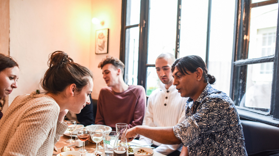 Keshar Sharma, 35 ans, chef indien et réfugié, discute de la nourriture qu'il a cuisinée avec des convives à West Country Girl - l'un des 11 restaurants parisiens invitant des chefs réfugiés dans leurs cuisines dans le cadre du Refugee Food Festival de juin 2016.