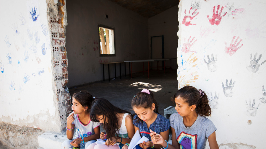 Des jeunes réfugiées sont installées sur les marches d'un espace récréatif informel dans un camp de Lagkadikia, au nord de la Grèce, où plus de 30% de la population sont des enfants.