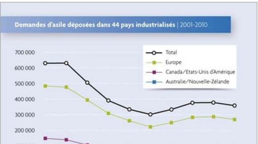 Au total, quelque 358 800 demandes d'asile ont été déposées dans les pays industrialisés en 2010 – soit une baisse de 5 % par rapport à 2009 et d'environ 42 % par rapport au niveau maximum de la décennie qui avait été atteint en 2001, quand près de 620 000 demandes d'asile avaient été déposées.