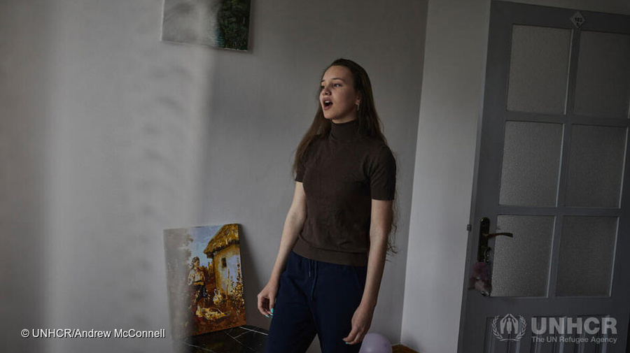 Daria, 15 ans, chante une chanson traditionnelle de son pays natal, l'Ukraine, dans le logement de sa famille à Chisinau, en Moldavie.