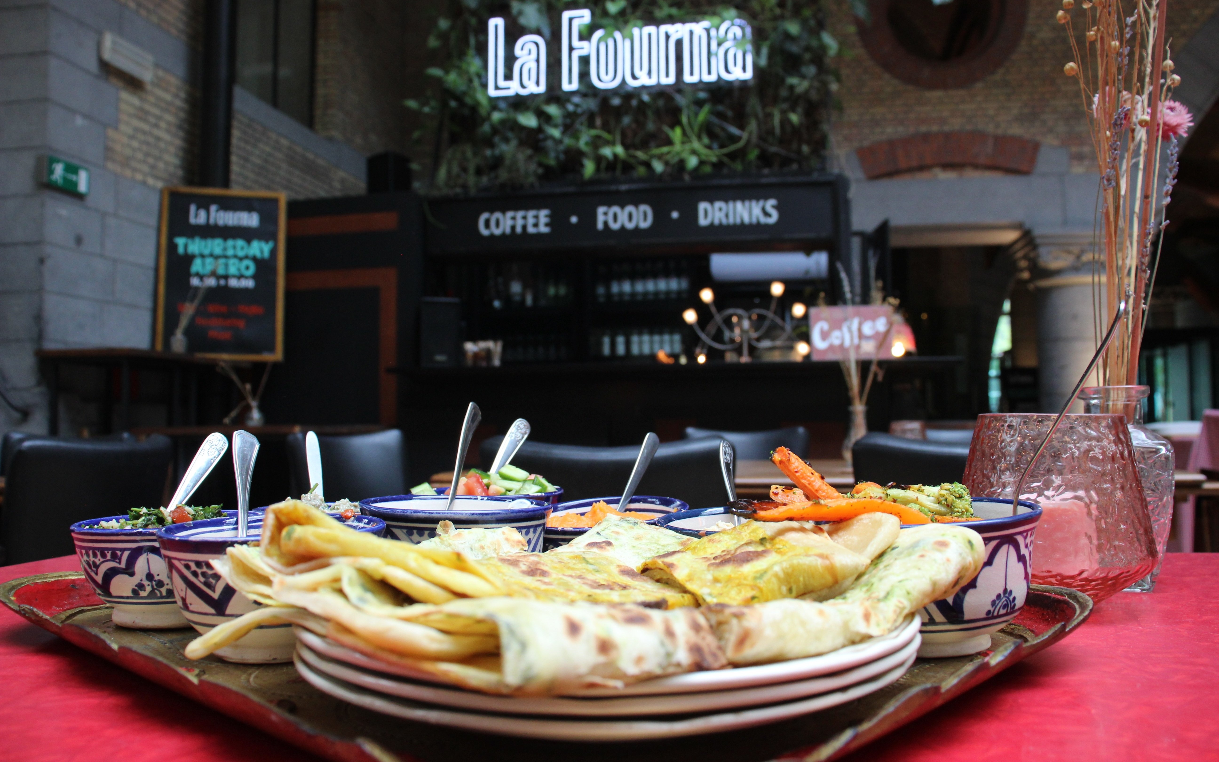 Situé à Tour & Taxis, au nord de Bruxelles, La Fourna sert un mélange unique de cuisine végétarienne moyen-orientale et africaine. Le restaurant a ouvert ses portes en 2020 par Hilde, une Belge originaire de la région, dans le but d'employer et de rendre autonomes les femmes migrantes, y compris réfugiées et demandeuses d'asile. Le plat de base de La Fourna est le pain plat pétri à la main et fraîchement cuit sur une plaque chauffante brûlante. Le pain se prête au partage, explique Hilde, et chaque culture a ses propres techniques. Les cheffes de La Fourna apportent leurs propres recettes et saveurs, avec une gamme de pâtes à tartiner et de plats d'accompagnement pour agrémenter les pains plats. Rachel, nouvelle membre de l'équipe, espère voir apparaître prochainement sur la carte des plats de son pays d'origine, l'Éthiopie. En attendant elle recommande vivement le baba-ganoush. La spacieuse terrasse intérieure et son décor verdoyant font de La Fourna l'endroit idéal pour déjeuner. Pour Rachel et les autres, La Fourna représente bien plus que cela : la possibilité d'accéder au monde du travail et de nouer des amitiés au sein d'une communauté de femmes fortes et solidaires.