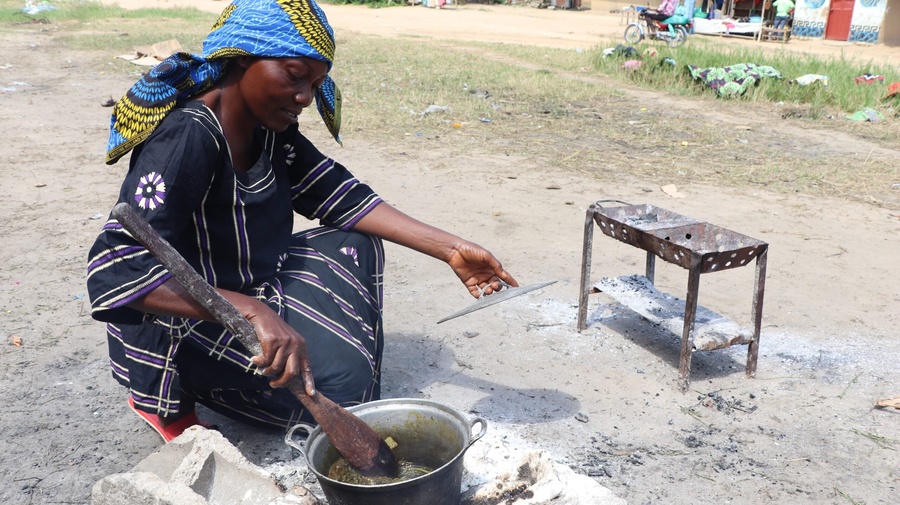 Mayanda Béatrice, 54, prépare des feuilles de patates douces pour sa famille. Elle a fui le village de Bokala, dans la province de Mai Ndombe, où elle travaillée dans les champs. Depuis août, elle habite dans le centre collectif de Bandundu, dans la province de Kwilu. Bétrice a marchée avec ses trois enfants et son beau fils pendant cinq jours afin de joindre Bandunu. © HCR/Simon Lubuku