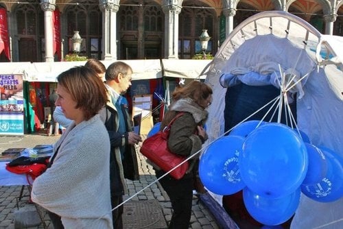 Ter gelegenheid van de Dag van de Verenigde Naties, dat UNHCR samen met het voltallige VN-team en de stad Brussel vierde, werd er een heus VN-informatiedorp opgetrokken op de Grote Markt, de UNHCR vluchtelingentent kon hier natuurlijk niet ontbreken.
