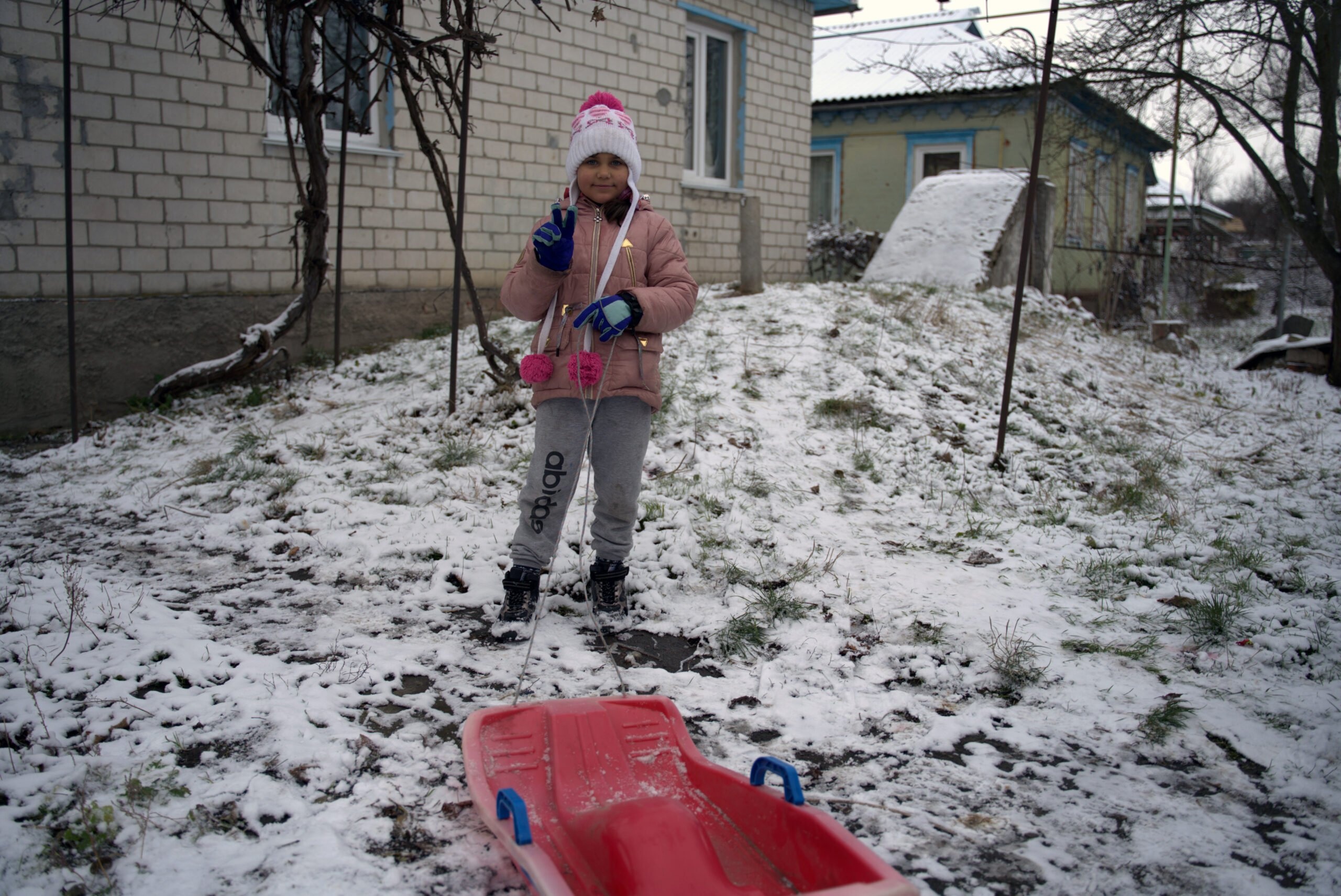 De zesjarige Melaniia werd vroeg wakker en zag vanuit haar slaapkamerraam een prachtig sneeuwlandschap. Ze stond snel op en ging warm gekleed met haar roze slee onder haar arm naar vrienden buiten om een sneeuwpop te maken en door hun straat te sleeën.