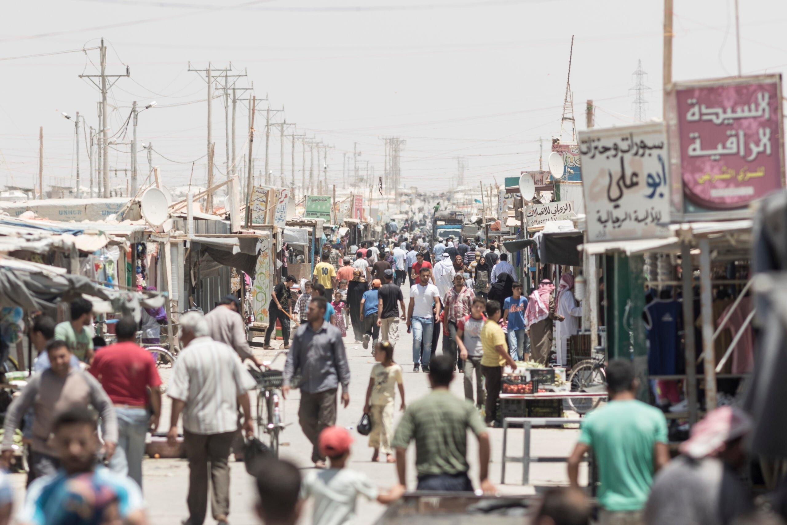 Drukke “Sham Elysees” marktstraat in Za’atari, juni 2015. © UNHCR/Christopher Herwig
