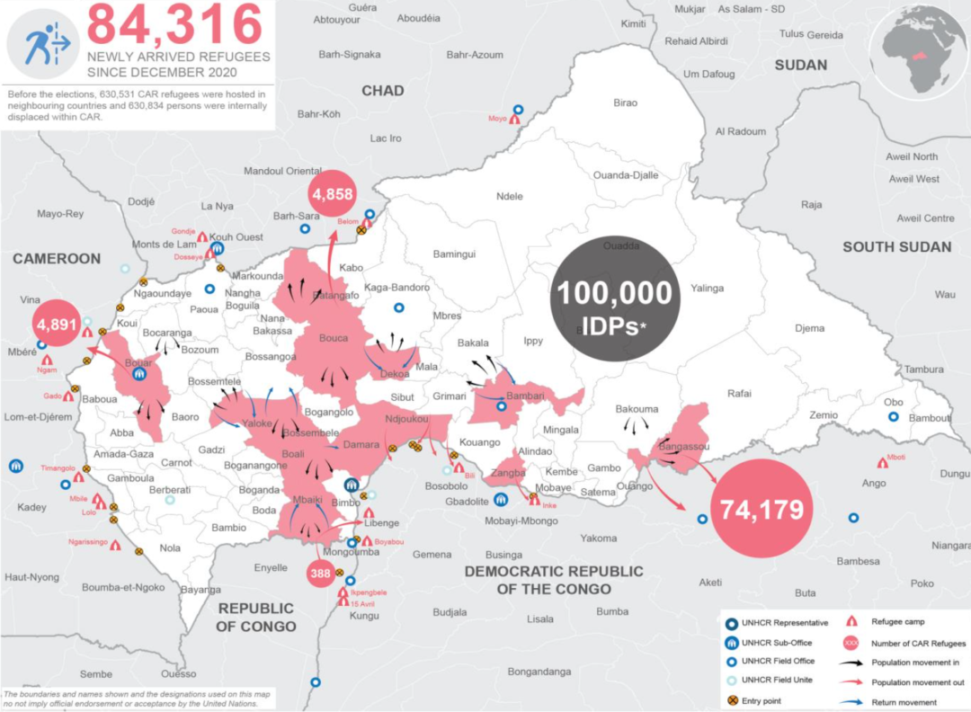 Zo’n 92.000 vluchtelingen zijn de grens met de Democratische Republiek Congo (DRC) overgestoken. Nog eens ongeveer 13.240 mensen zijn naar Kameroen, Tsjaad en Congo-Brazzaville gevlucht. Het geweld in de CAR brak uit in december 2020, voorafgaand aan de verkiezingen. Vluchtelingen blijven arriveren.