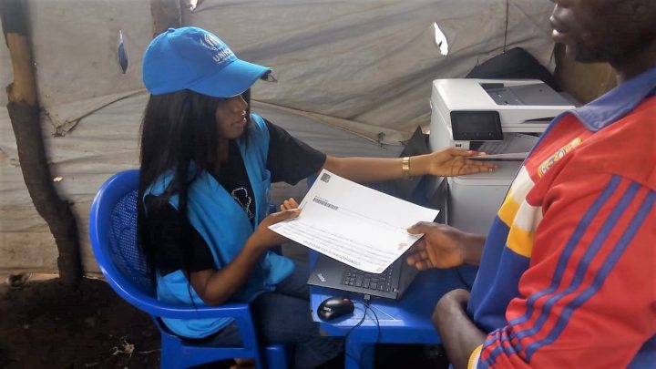Jemima Matende, Registration Assistant, giving a ‘Comprovante do Registo’ to a refugee ©UNHCR/ Omotola Akindipe