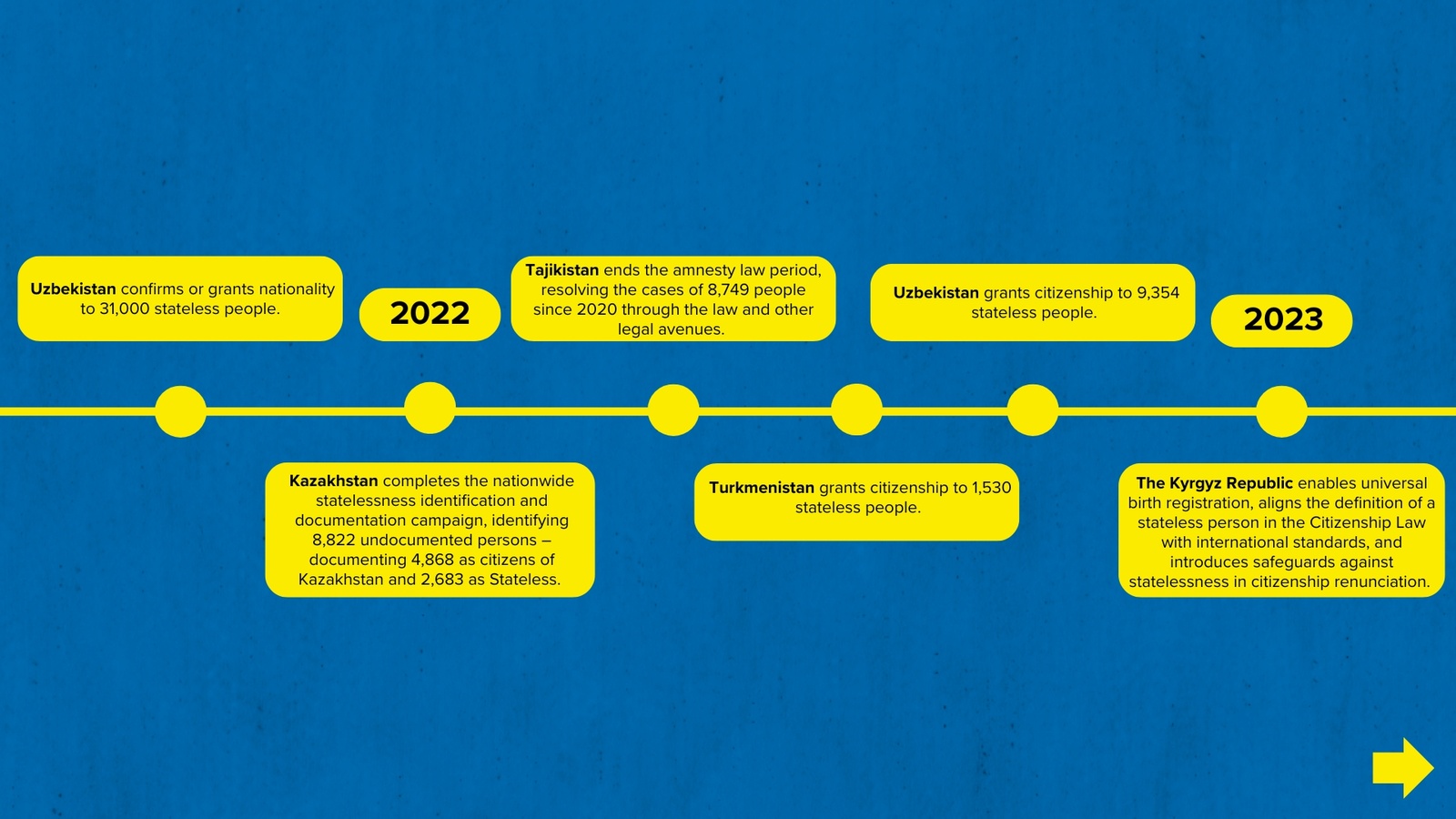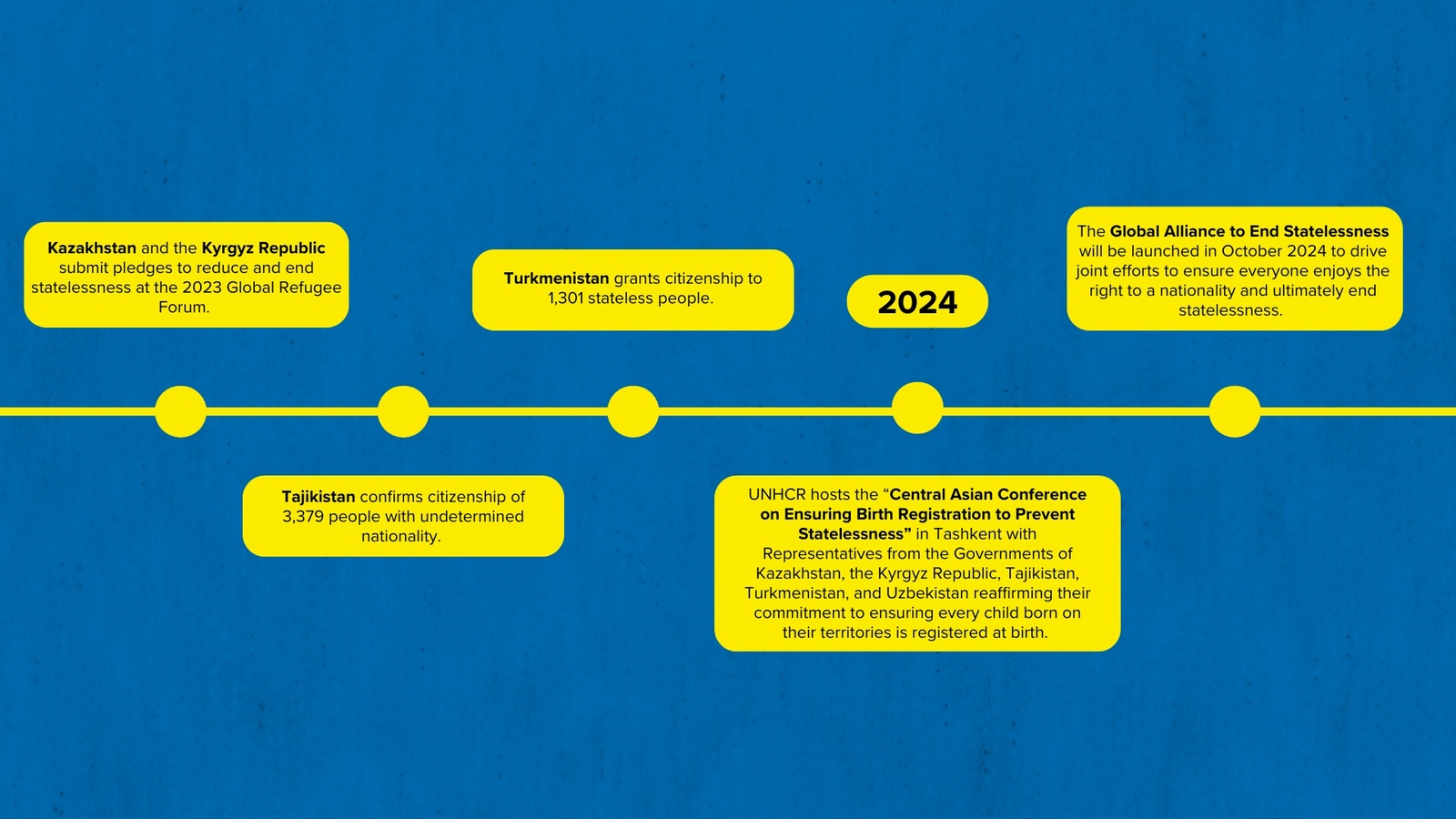 As of January 2024, over 38,000 people were known to be stateless or with undetermined nationality across Kazakhstan, the Kyrgyz Republic, Tajikistan, Turkmenistan and Uzbekistan. With stateless people continuously becoming identified, the true number is believed to be higher.