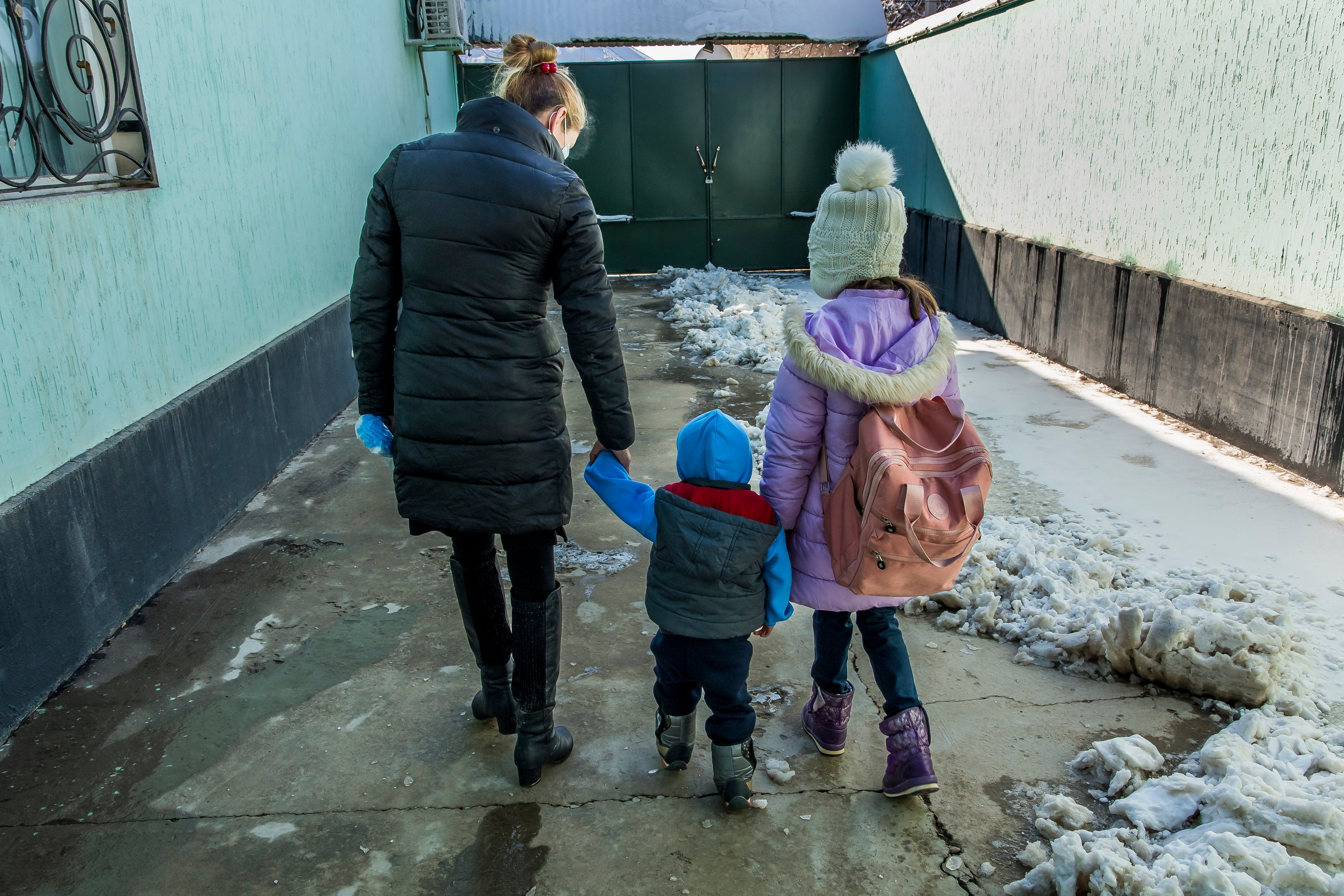 Roza Nurymova, 36, and two of her children leave the office of Sana Sezim. © UNHCR/ Frederic Noy