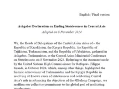 Декларация 2024 жылғы 8 қарашада Ашхабад қаласында Түрікменстан Үкіметі мен UNHCR, яғни Біріккен Ұлттар Ұйымының Босқындар ісі жөніндегі агенттігі бірлесіп ұйымдастырған "Орталық Азиядағы азаматтығы жоқтықты жою" Министрлік конференциясының негізгі қорытындысы болып табылады.