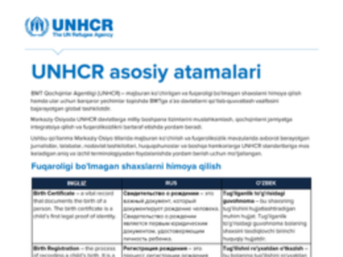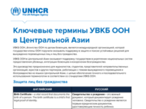 Доступное на казахском, кыргызском, таджикском, туркменском, узбекском, русском и английском языках Руководство по ключевым терминам предназначено для поддержки журналистов, студентов, представителей неправительственных организаций, юристов и других партнеров, работающих с темами вынужденного перемещения и безгражданства на языках Центральной Азии, с целью обеспечения точного и последовательного использования терминологии.