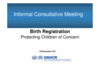 22 Nov 2011 ... Informal Consultative Meeting Birth Registration Protecting Children of Concern 22 November 2011 2 Why is birth registration important? Birth registration establishes basic facts about a person’s ...... -