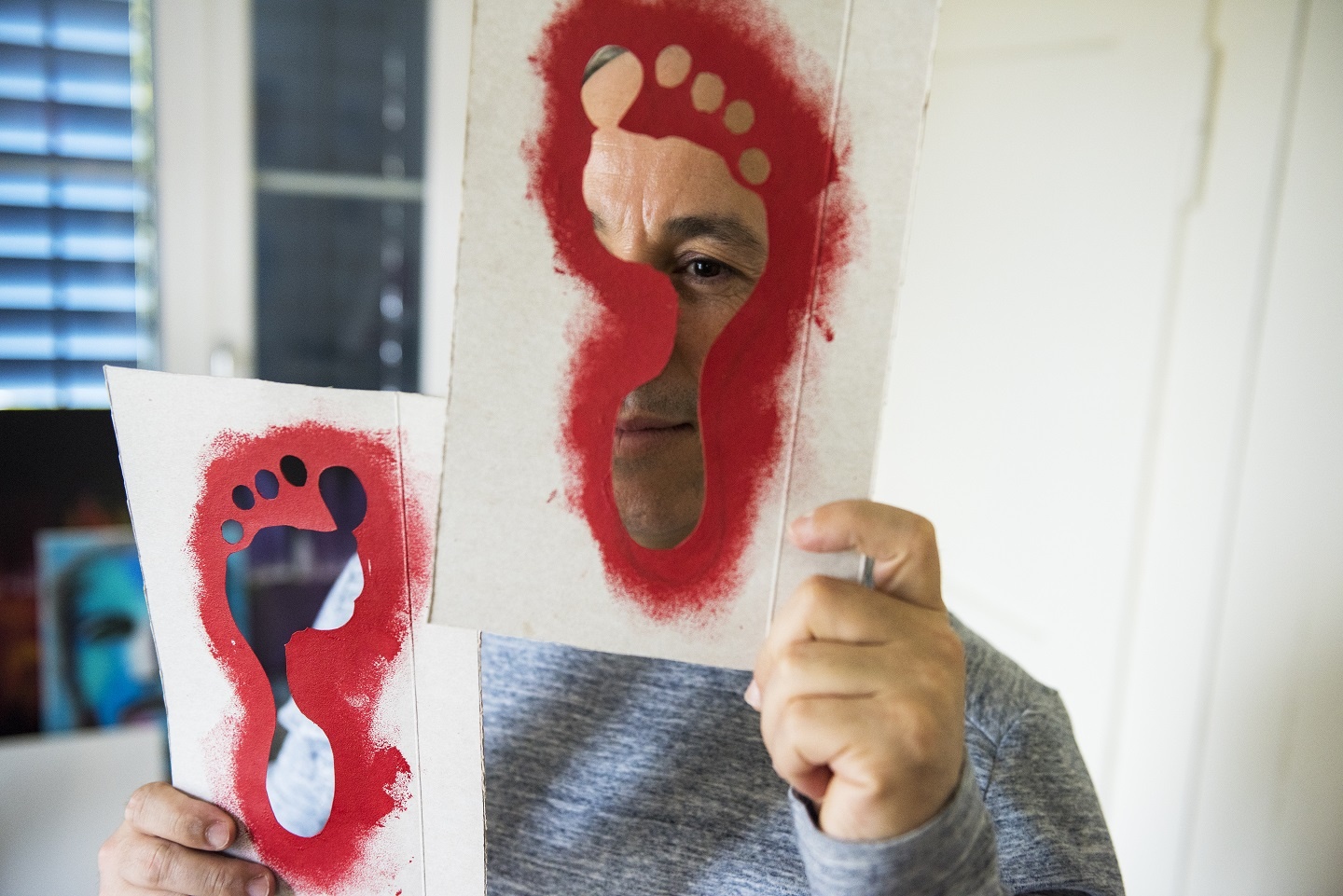 Allam Fakhour se réjouit de voir ses œuvres exposées dans les rues de la ville de Bâle pendant la célèbre foire d’art contemporain Art Basel. Réfugié syrien résidant aujourd’hui en Suisse, il fait partie des 11 artistes dont le travail sera ainsi mis en lumière par le projet «Art Stands with Refugees» du HCR. Pour l’occasion, il a décidé de présenter une mappemonde parcourue de petites empreintes de pied d’un rouge écarlate. Un choix qui ne doit rien au hasard: «Le sang de nos enfants entache la pureté du monde civilisé», commente-t-il gravement. Sur une autre œuvre créée par l’artiste, les rêves des enfants subissant la guerre prennent vie sur la toile, un ballon permettant à l’un d’eux de fuir le conflit.