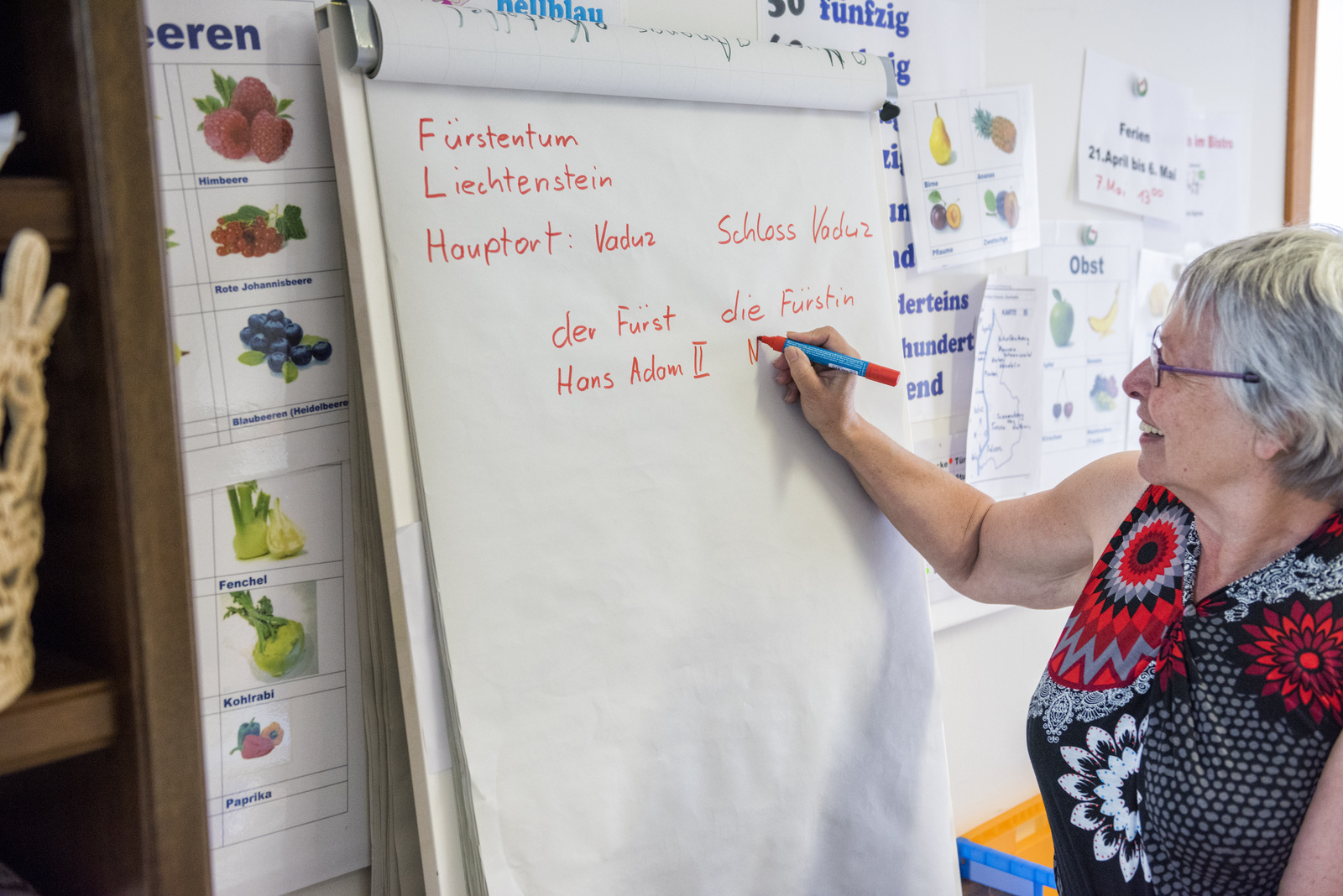 Nach Liechtenstein kommen jedes Jahr etwa 150 Asylsuchende. Das Verfahren ähnelt dem der Schweiz, auch wenn es ein paar Unterschiede gibt. So können Neuankömmlinge zum Beispiel ab dem ersten Tag einer Arbeit nachgehen. „Viele Flüchtlinge wissen Anfangs oft gar nicht, wo sie genau gelandet sind. Deshalb ist es umso wichtiger, ihnen so früh wie möglich zu vermitteln, wie sie hier klarkommen können“, ist sich Siglinde sicher. Ihr ist es wichtig, eine lockere Atmosphäre zu schaffen, in der viel gelacht wird. „Mit Druck komme ich bei den Teilnehmenden nicht weit. Viele haben nie richtig gelernt zu lernen. Hausaufgaben gebe ich deshalb keine. Es macht mir auch nichts aus, bestimmte Punkte mehrfach zu wiederholen. Geduld ist sehr wichtig“, betont sie.
