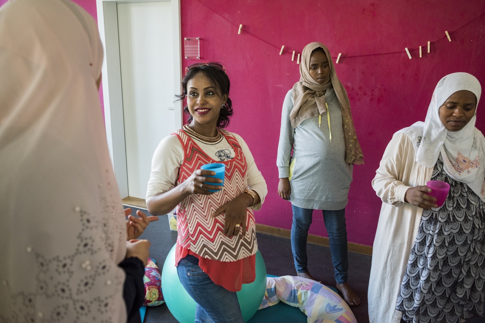 In der Mitte eines bunten, mit Yogamatten und Stillkissen übersäten Raumes richtet sich eine Hebamme auf Deutsch an eine Gruppe von Frauen, deren Schwangerschaft bereits mehr als sechs Monate fortgeschritten ist. Den Frauen stehen zwei Dolmetscher zur Seite, die das Gesagte ins Arabische und Suaheli übertragen. Es geht um den Ablauf eines Kaiserschnitts, Rückenübungen und ums Stillen. Während des zweistündigen Kurses kommen viele Fragen auf: Kann ich in der Stillzeit scharfe Nahrung zu mir nehmen? Woher weiss ich, wann mein Baby Hunger hat? Was sind die Vor- und Nachteile einer Periduralanästhesie (Betäubung der Wirbelsäule) bei der Entbindung? Zwischen den Fragen finden Dehnungs- und Entspannungsübungen statt.