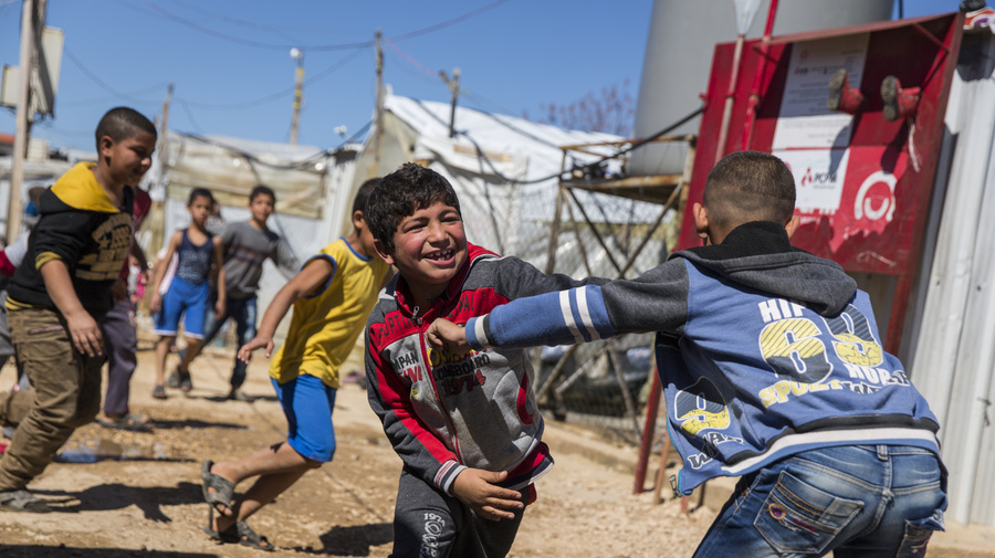 Abdulhay,八岁,和其他孩子一起在黎巴嫩北部一个非正式难民安置点中踢足球。© UNHCR/Andrew McConnell