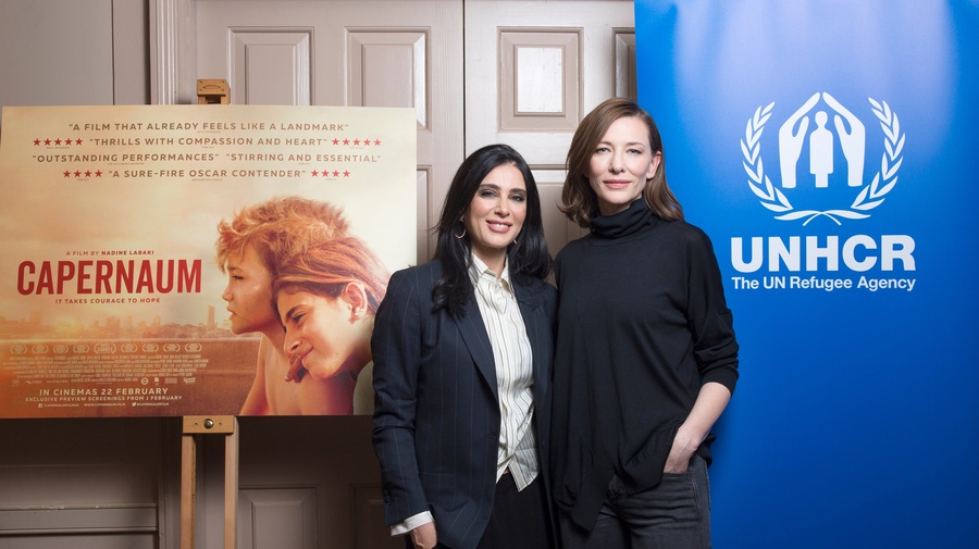 在伦敦,电影导演娜丁·拉巴基和联合国难民署亲善大使凯特·布兰切特一同参加电影《迦百农》在联合国难民署的放映仪式。 © UNHCR/Tom Pilston