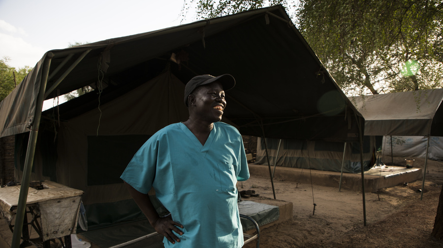 Evan Atar Adaha在南苏丹布尼的帐篷前。他说,“当我知道我的工作能让许多人远离伤痛和死亡时,我真的非常开心。”© UNHCR/Will Swanson