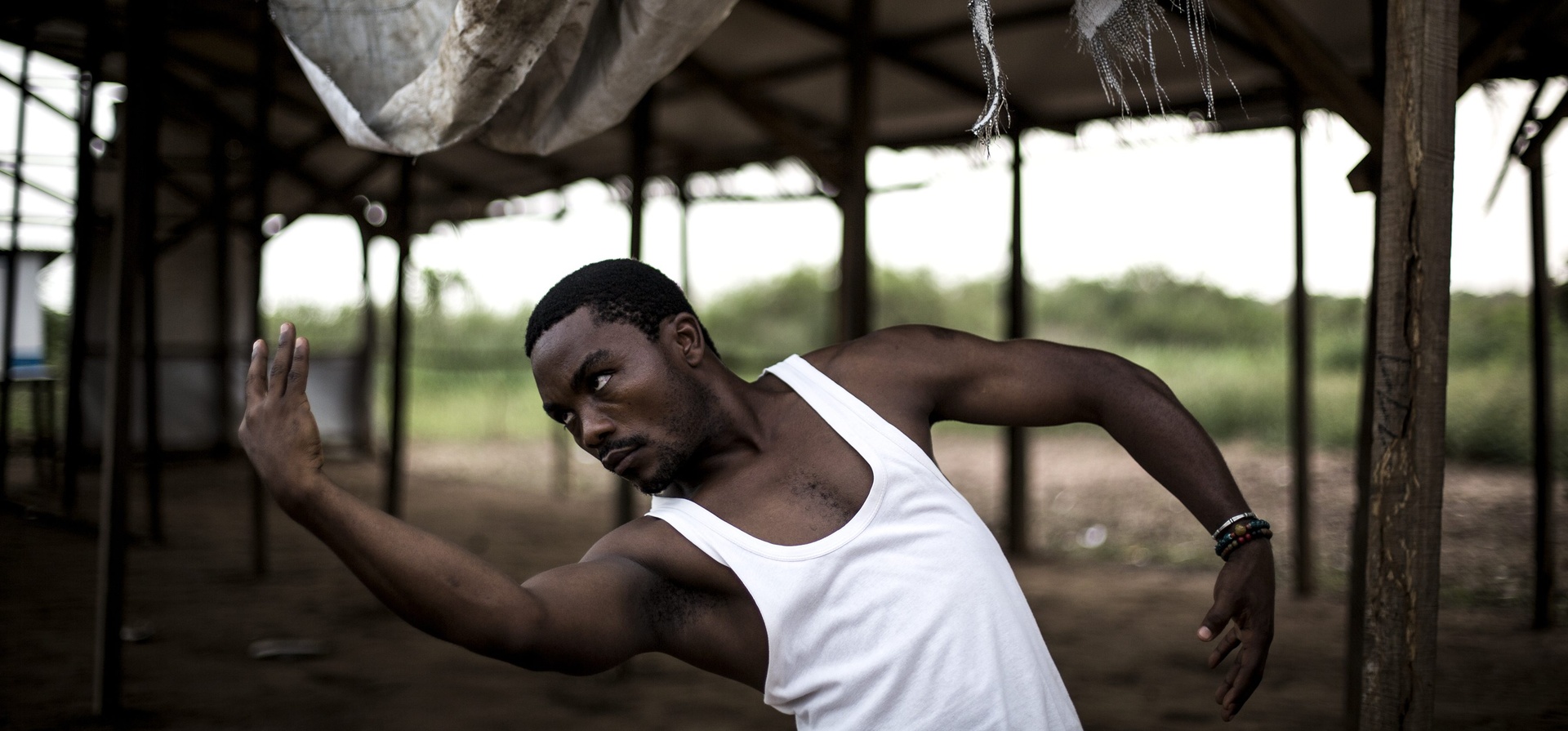 40岁的Fabrice Don de Dieu 是“难民在行动”项目的编舞者,他正在Inke难民营表演舞步。© UNHCR/John Wessels