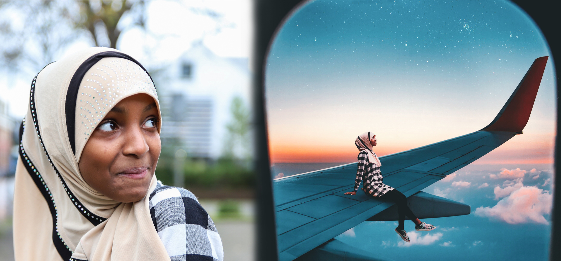在这一系列中,玛娜尔梦想成为一名空姐。照片里她坐在一架飞机的机翼上,在风景如画的夜空中翱翔。