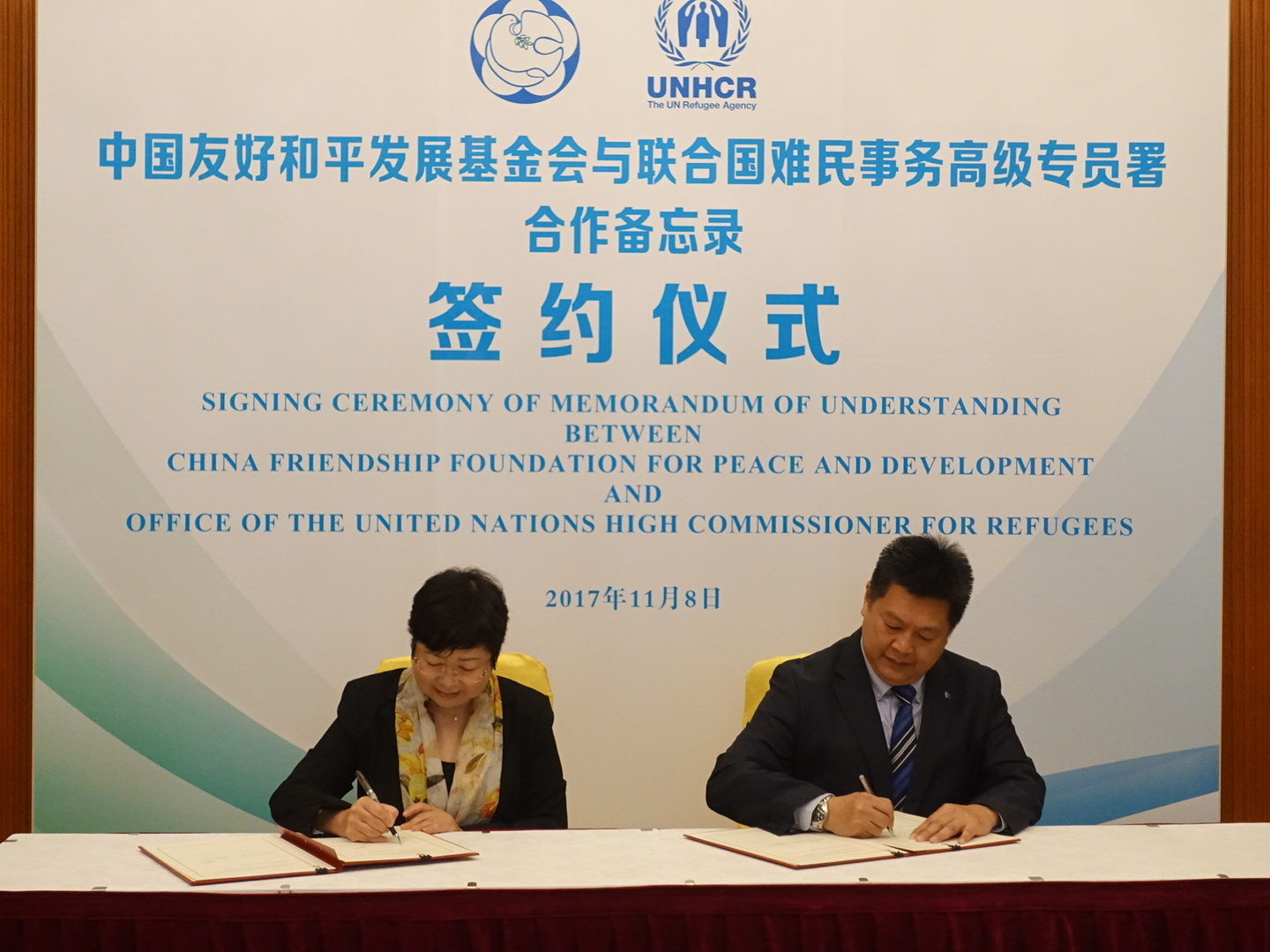 中国北京,2017年11月8日——8日上午,联合国难民署与中国友好和平发展基金会举行合作备忘录签约仪式。联合国难民署驻华代表Francis Teoh先生、中国友好和平发展基金会秘书长贾伶女士分别代表联合国难民署和中国友好和平发展基金会在备忘录上签字。