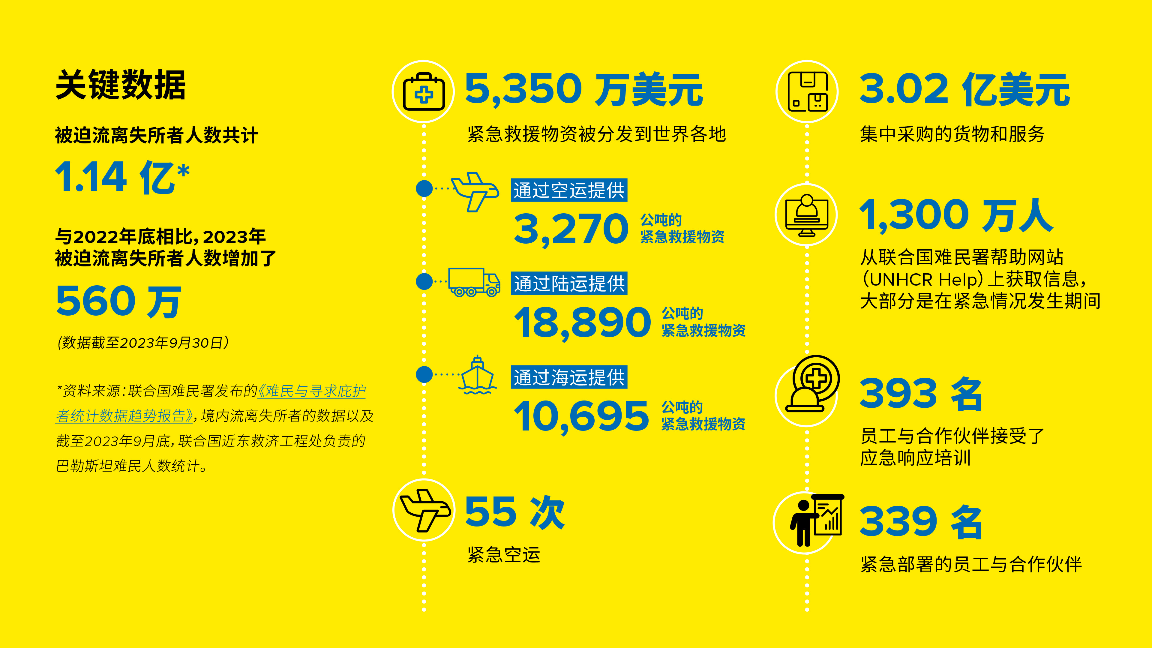 2024年1月19日,联合国难民署发布《2023年紧急情况准备和响应》报告。2023年,为有效应对全球人道主义危机,联合国难民署在全球共发布43项紧急声明,加大了对29个国家的支持力度,并发送了740万件救援物品,从全球七个仓库中运送了价值5,350万美元的紧急物资,为全球1,670万人提供了援助。