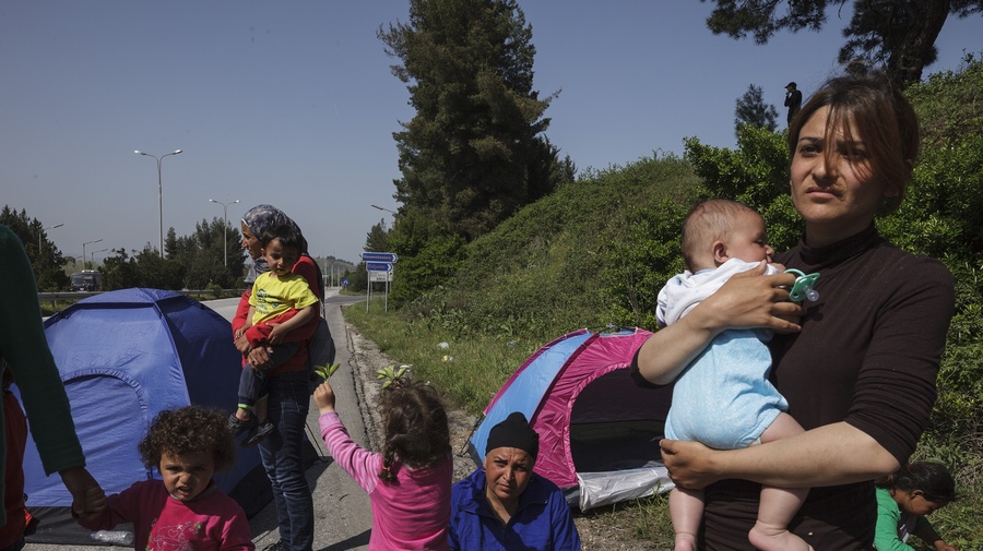 Refugee women holding their children block the A1 highway, which connects Greece to the Former Yugoslav Republic of Macedonia, as a form of protest against the first returns of migrants and refugees back to Turkey under the terms of a new EU deal with Turkey. ; Despite the closure of the so called Western Balkan Route more than 10,000 refugees and migrants remain on the Greek side of the border with the Former Yugoslav Republic of Macedonia, near the small village of Idomeni, hoping that the borders will re-open and they will be able to continue their journey northwards. With tensions running high due to the lack of food, medicine and proper accommodation small groups of refugees and migrants stage protests in an effort to turn the attention of the European Union to their plight.